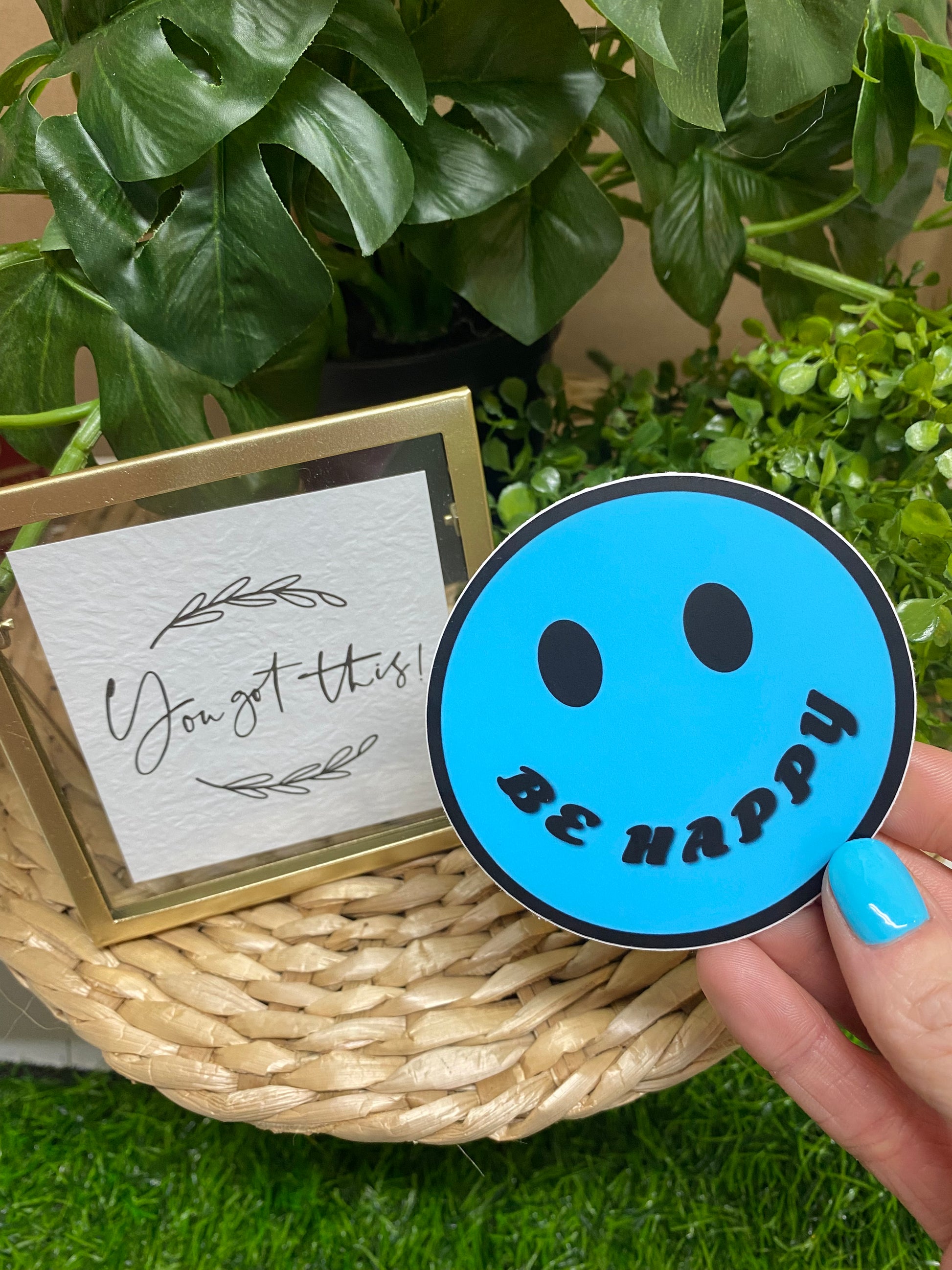 Blue “Be Happy” smiley face