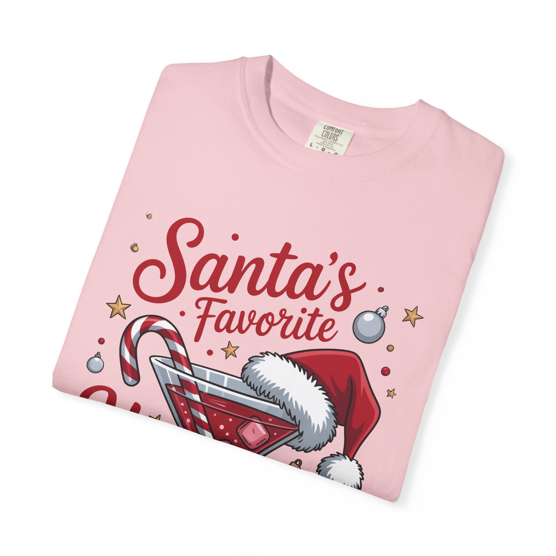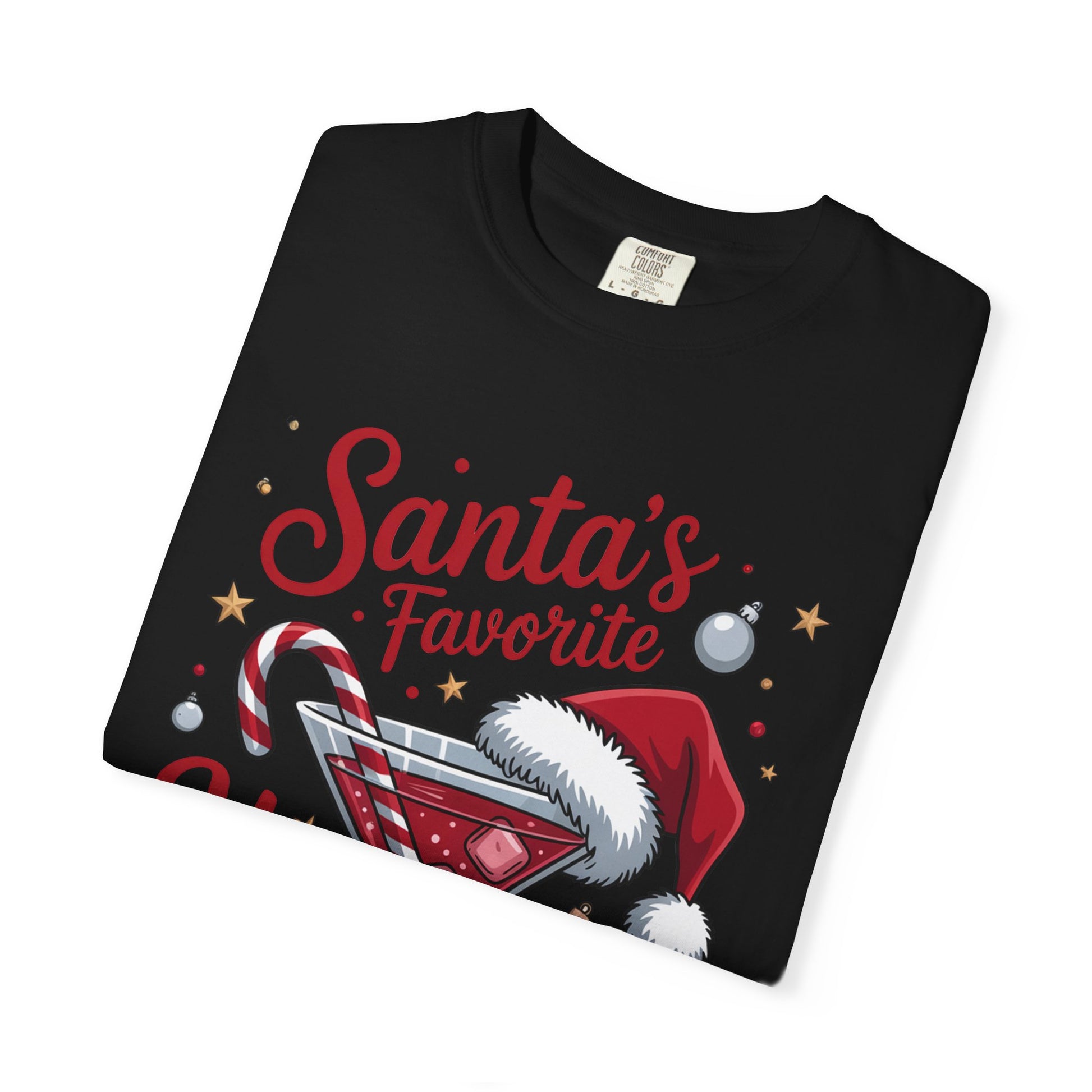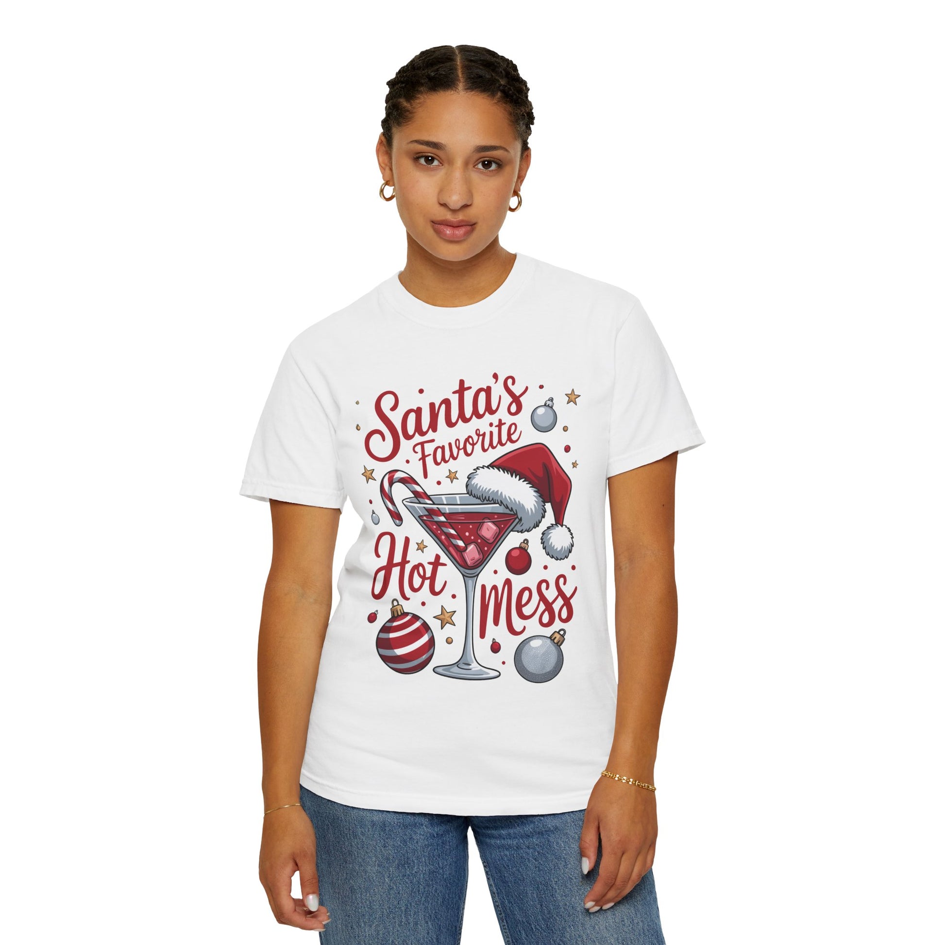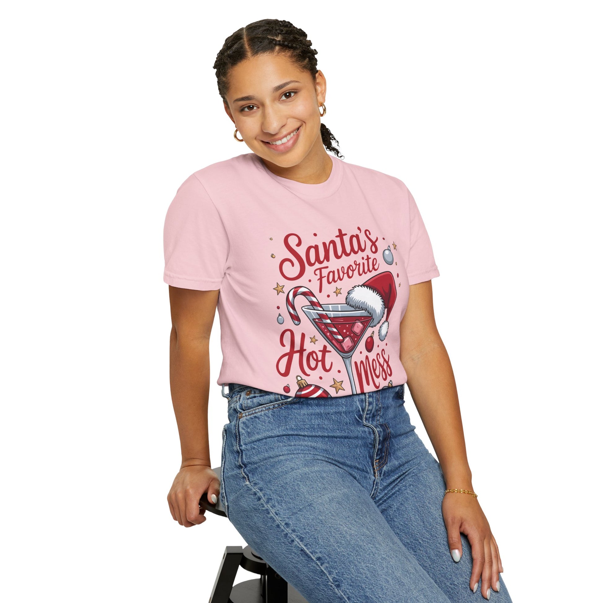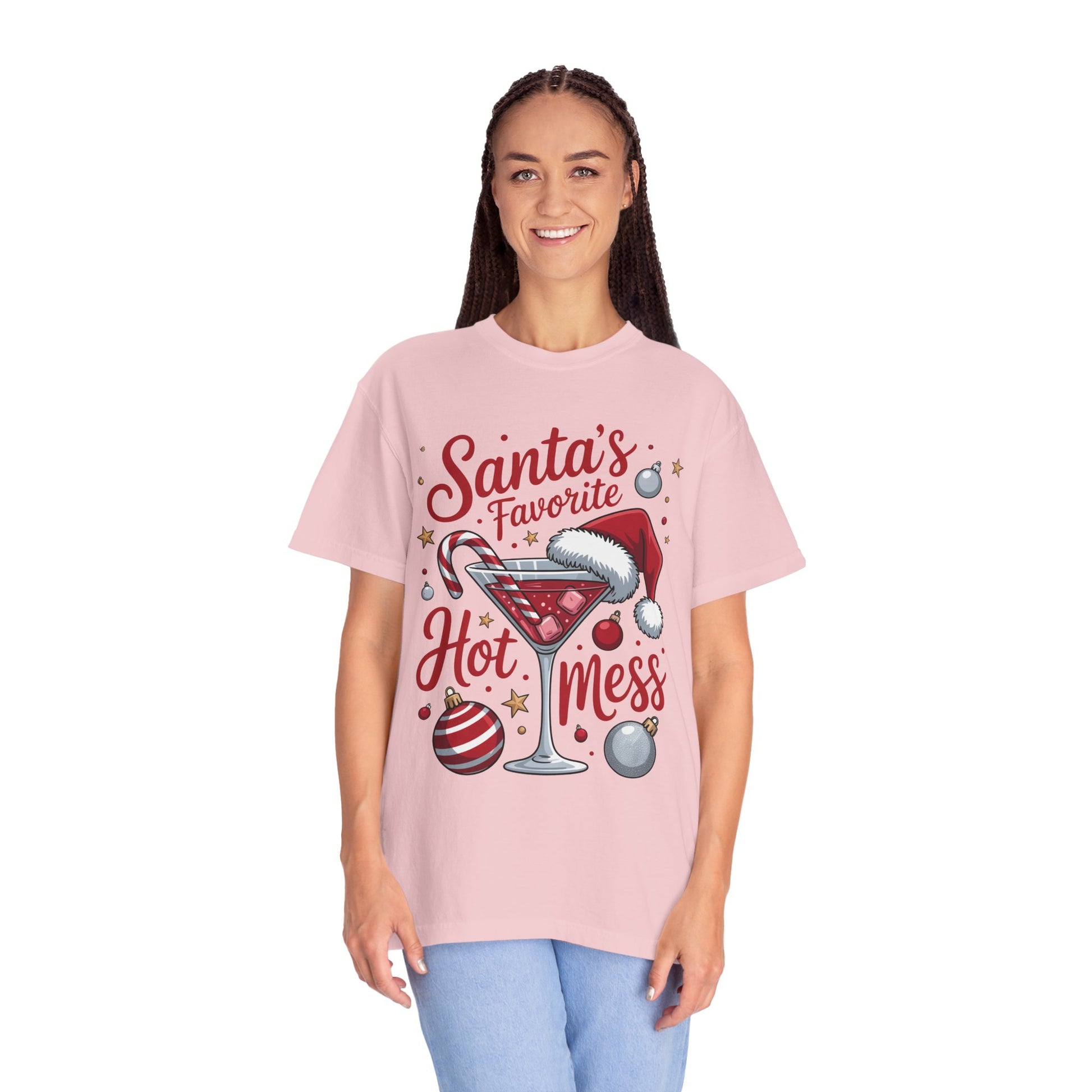 This garment-dyed tee brings playful holiday spirit to everyday wear A festive martini crowned with a Santa hat, candy cane stirrer and scattered ornaments, captioned “Santa’s Favorite Hot Mess.” Short moments of laughter and cozy chaos come to mind—eggnog on the counter, twinkling lights, and friends arriving late but full of cheer. Wear it to low-key gatherings, cookie swaps, or when you want a wink of humor while wrapping gifts. The soft, post-dye finish and roomy cut make it comfortable for long evenings around the tree, while the sewn-in label and durable double-needle seams keep it ready for years of holiday repeat wear.